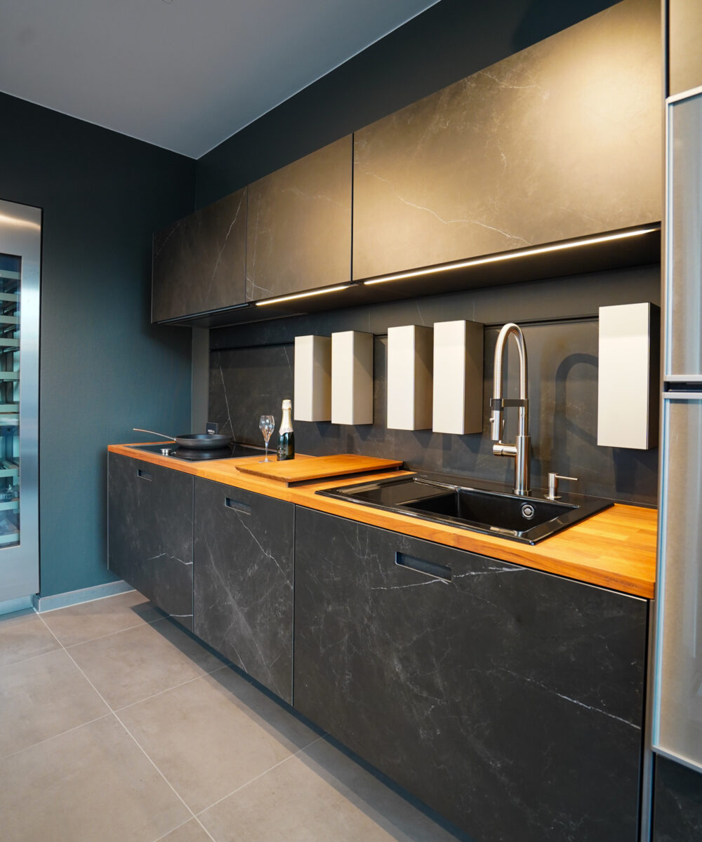 Auch bei der Dunstabzugslösung setzt die Küche Maßstäbe: Die BERBEL Umlufthaube BEH90 FLU arbeitet nahezu geräuschlos und sorgt für saubere Luft. Abgerundet wird die Ausstattung durch die elegante Villeroy & Boch Spüle Subway 45 Chromit c+ mit passendem Schneidbrett aus Nussbaum sowie die Steel Expert 2.0 Armatur aus massivem Edelstahl inklusive Seifenspender.