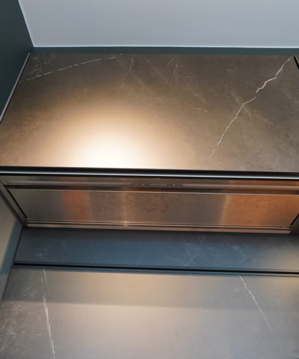Technisch ist diese Ausstellungsküche auf höchstem Niveau ausgestattet. Das Gaggenau Induktionskochfeld CI272113, der Backofen BO420-112 und der Dampfbackofen BS454-111 garantieren präzises Kochen und Backen auf Profi-Niveau. Der Gaggenau Geschirrspüler DF480100F sorgt für leises, effizientes Spülen. Ein Kühlschrank wird nach Vereinbarung ergänzt.