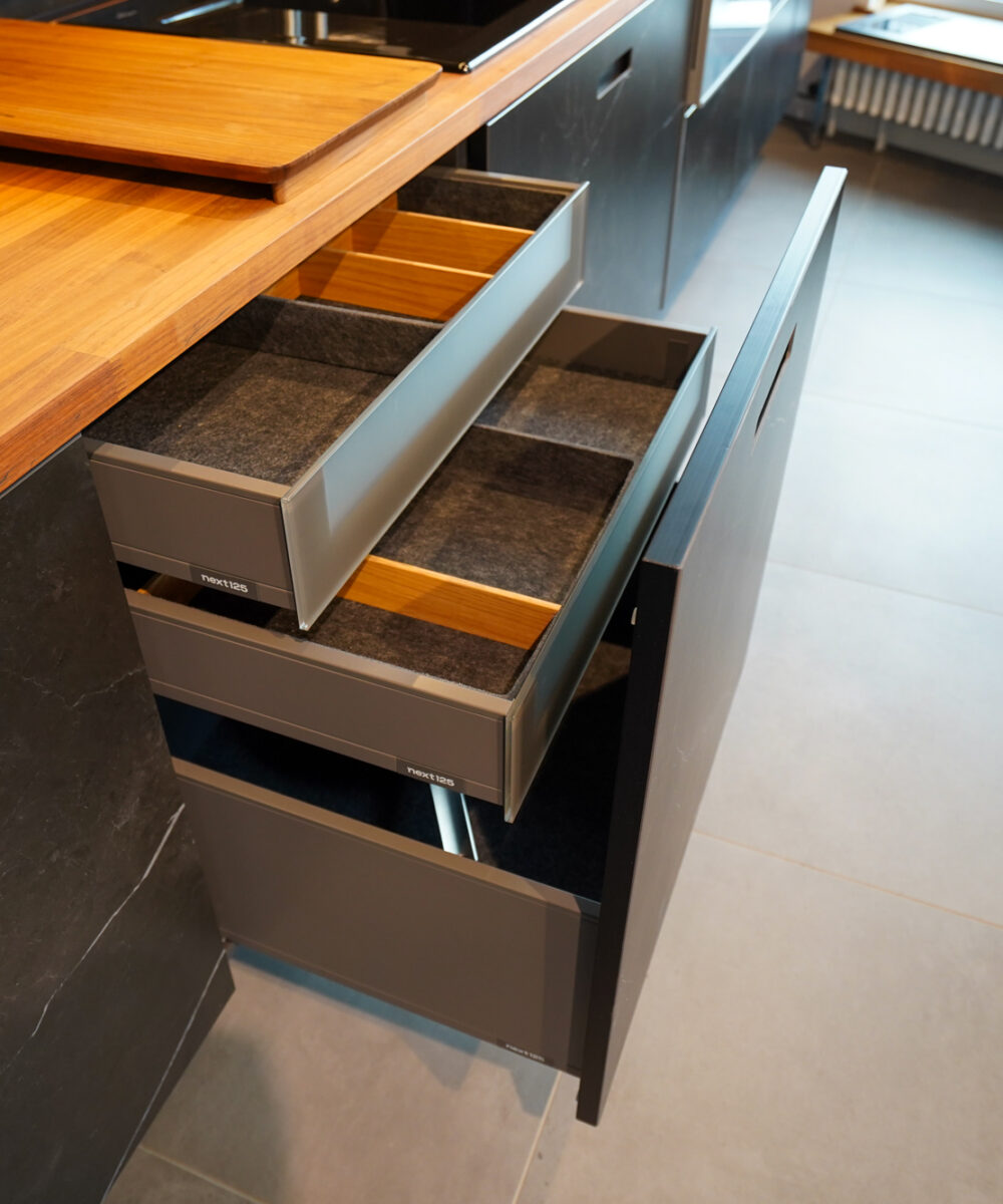 Den idealen Kontrast dazu bildet die 30 mm starke Arbeitsplatte aus massivem Nussbaum, die Wärme und Natürlichkeit einbringt. Gemeinsam entsteht eine hochwertige Komposition aus edlen Oberflächen und funktionaler Klarheit – ideal für stilbewusste Individualisten.